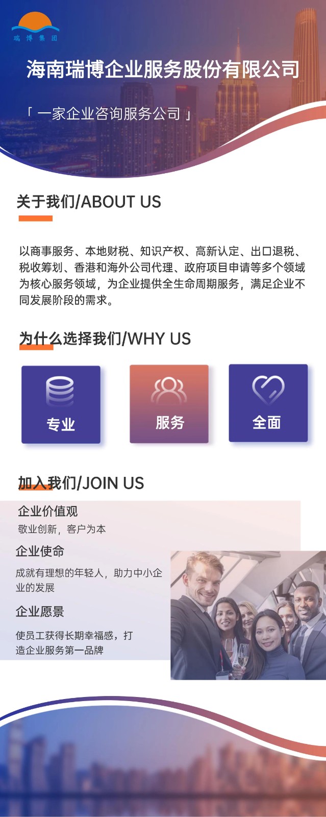 | 企業(yè)說明: | 海南瑞博企業(yè)服務(wù)股份有限公司是瑞博集團下屬子公司,自2018年海南自貿(mào)港開放以來。瑞博集團積極響應(yīng)國家的號召,通過充分考察后,于海南省海口市成立海南瑞博企業(yè)服務(wù)股份有限公司,主要以商事服務(wù)、本地財稅、知識產(chǎn)權(quán)、高新認定、出口退稅、稅收籌劃、香港和海外公司代理、政府項目申請等多個領(lǐng)域為核心服務(wù)領(lǐng)域,為企業(yè)提供全生命周期服務(wù),滿足企業(yè)不同發(fā)展階段的需求。 瑞博集團下屬直營子公司分部在北京、西安、海南、香港等地,全國主要一二線城市的分部陸續(xù)成立中,跨區(qū)域配合,輻射全國,以滿足客戶跨區(qū)域服務(wù)需求;同時瑞博持續(xù)拓展延伸資源合作平臺,引入各類商業(yè)服務(wù)機構(gòu)供應(yīng)鏈合作機構(gòu),打通了產(chǎn)業(yè)鏈上下游領(lǐng)域的立體服務(wù)生態(tài),企業(yè)全品類服務(wù)能力,得到了廣大的客戶的認可與信賴。 |